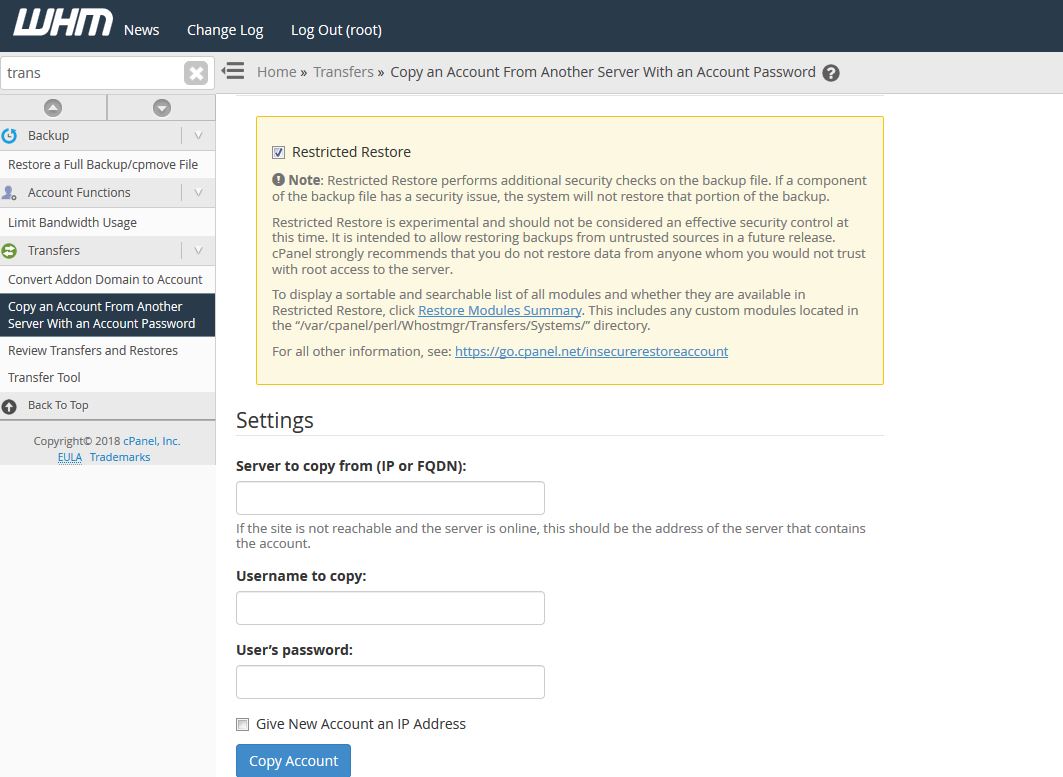 Já sei, agora entramos no cpanel e criamos um backup full, depois baixa e pelo WHM restaura. Sim este procedimento pode ser feito, porém é mais demorado e pode haver erros durante o processo de download e upload. Com este método, o backup será gerado no servidor atual e automaticamente transferido para o servidor novo e restaurado.